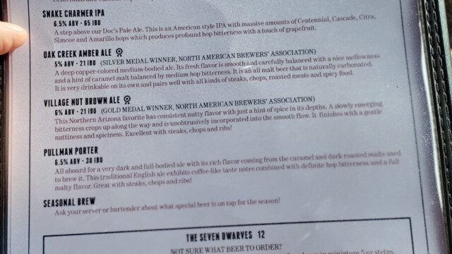 There are just two breweries in Sedona, and unfortunately only one was open during our pass through. Even though Sedona Beer Company wasn’t open, Oak Creek Brewery and Grill opened just in time for us to grab some lunch and a flight. Most of the beers on our flight of 7 were rated average on Untappd. With the exception of the Horseshoe Hefeweizen, which was our favorite and a near flawless execution of a hefe. We would have to go back and check through our notes, but Oak Creeks hefe was certainly one of the best hefes we had on this trip – also their lunch menu was awesome.